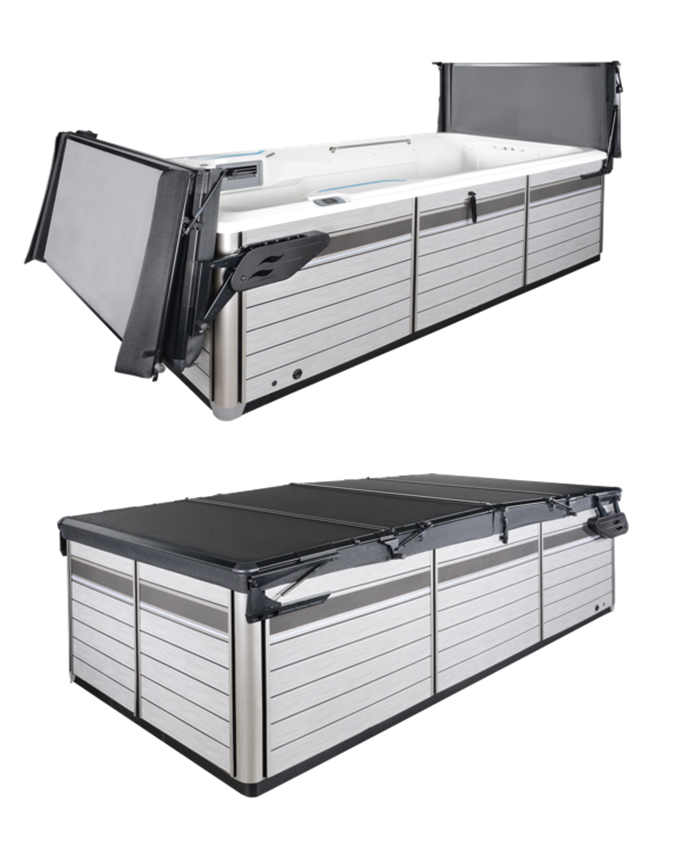 Smartop Swim Spa can be made for swim spas up to 20 feet in length. The integrated cover lift system with the exclusive EAS Lift and Assist component enables easy opening and closing using a series of hydraulic shocks that assist with the lifting process. The unique overlap seal between the two covers creates a tight seal that keeps the heat in while keeping dirt and debris out.